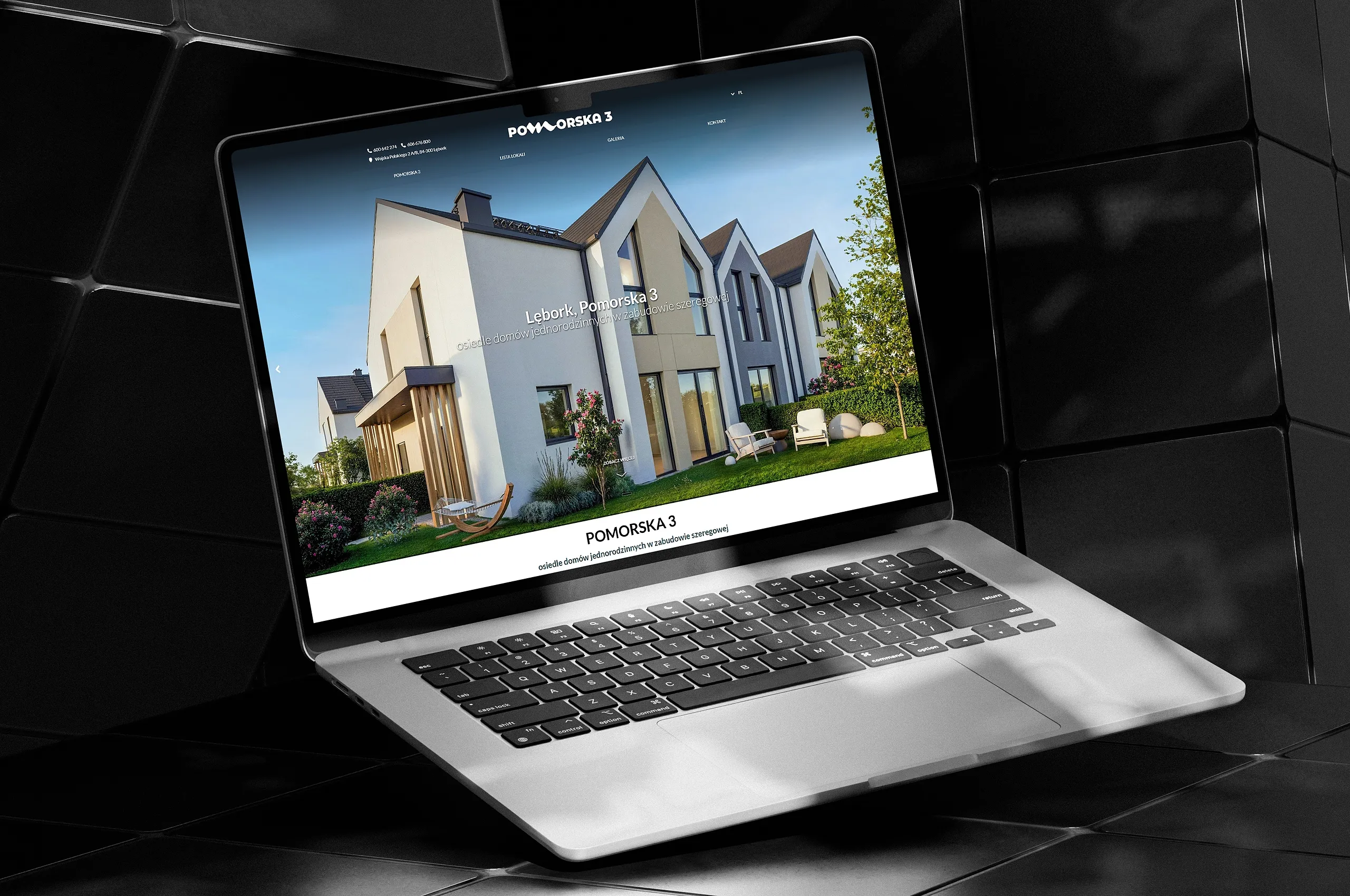Projekt. Minimalistyczna estetyka, nawiązująca do harmonii osiedla i komfortu życia. Kolory, zdjęcia domów i wizualizacje prezentują projekt w przyjaznym otoczeniu. Intuicyjna nawigacja ułatwia szybkie poruszanie się po stronie. Interaktywna mapa osiedla z możliwością wyboru poszczególnych mieszkań, prezentuje dostępność, metraż i powierzchnię terenu przynależnego. Informacje w infografikach i szczegółowych opisach o zastosowanych materiałach, energooszczędnych rozwiązaniach i nowoczesnych technologiach podkreślają atrakcyjność inwestycji i niskie koszty utrzymania. Dobrze uwidocznione przyciski CTA i formularze kontaktowe ułatwiają szybki kontakt z deweloperem. Lista lokali z wyszukiwarką i filtrowaniem zawiera spis oferowanych mieszkań wraz z dużymi wizualizacjami, możliwością pobrania karty lokalu w formacie PDF i formularzem kontaktowym do biura sprzedaży nieruchomości.