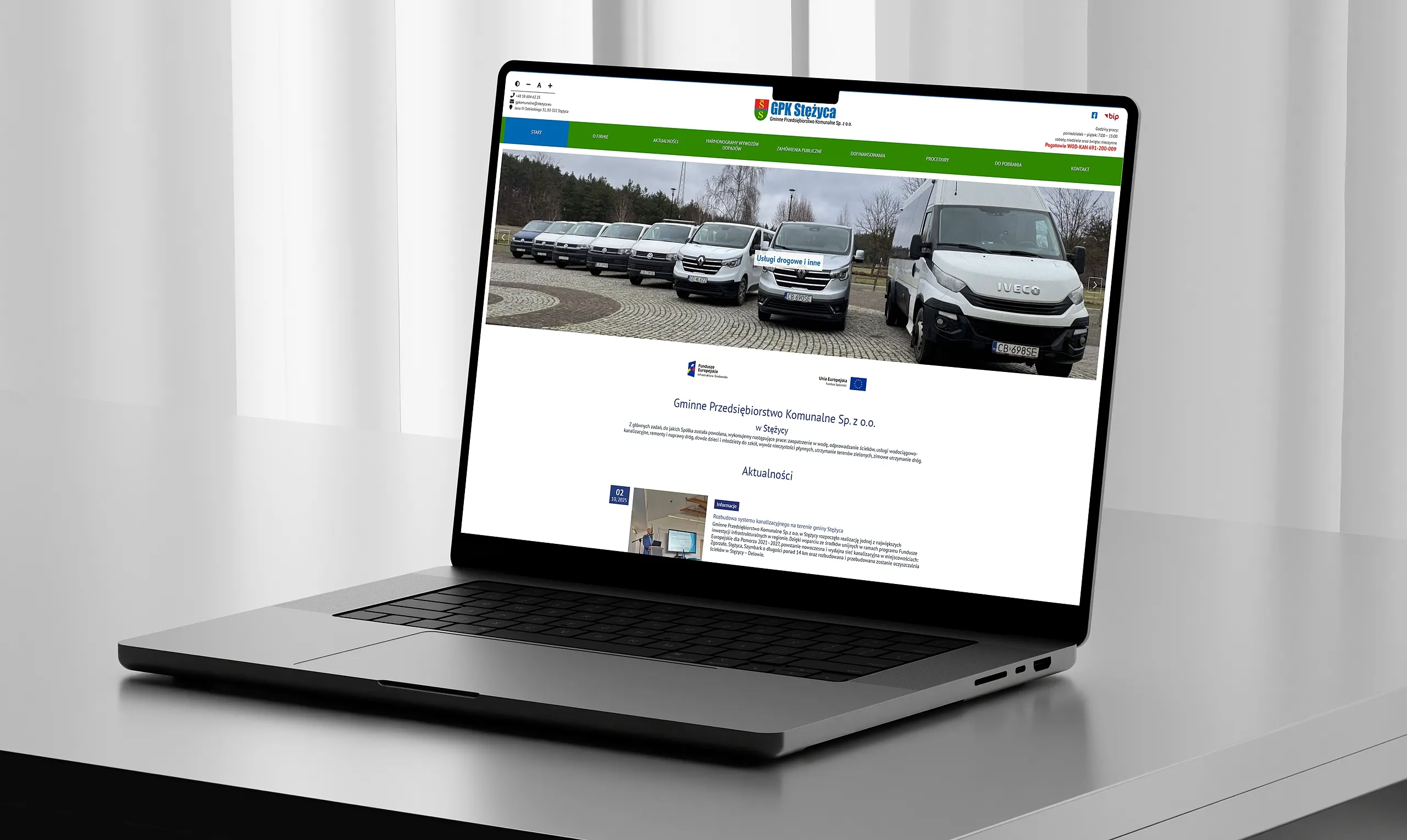 Projekt. Grafika nawiązuje do wody i natury, użyliśmy odcieni błękitu, szarości i bieli. Motywy wizualne związane są z zatoką oraz procesem oczyszczania ścieków. Na stronie zawarte są szczegółowe informacje o działalności: opis działalności spółki, w tym szczegóły dotyczące oczyszczalni i ich technologii, przejrzyste informacje o usługach i dane o wpływie działalności na środowisko oraz podejmowanych inicjatywach ekologicznych. W stopce umieściliśmy ważne linki takie jak: Deklaracja dostępności, Klauzula informacyjna, Polityka cookies. Strona przyjazna jest dla użytkownika w pełni responsywna, dostosowana do urządzeń mobilnych i tabletów, posiada intuicyjny interfejs, umożliwiający szybki dostęp do kluczowych informacji zarówno mieszkańcom, jak i firmom, zgodna z wymogami dostępności dla osób z niepełnosprawnościami WCAG 2.1.